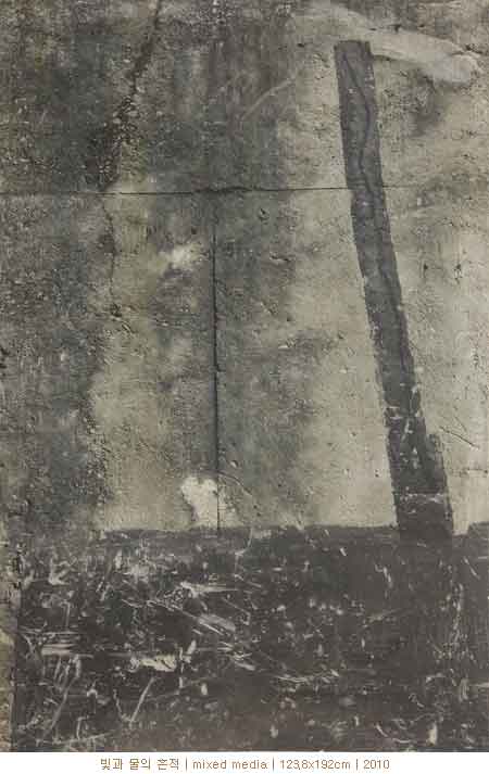 시간은 그렇게 존재의 피부위에 다소 잔인하게 서식한다. 그래서 그런 피부를 보고 있노라면 아련하고 쓸쓸하다. 나 역시 저렇게 시간에 의해 잠식되어 가고 있음을 문득 깨닫는 것이다. 이 냉랭한 회색톤의 벽은 시간 속에서 무수한 상처를 입은 벽을 그대로 드러낸다. 그 벽은 부분적으로 자갈이 드러나고 포크레인이 끌고 간 자국과 못이 박혀있던 구멍, 물이 스며들거나 이런저런 시간의 잔해들이 머물고 떨어져 나간 자취를 고스란히 증거한다. 갈라지고 깨지고 터져나간 자위들이 자욱한 것이다. 작가는 그 벽을 보면서 그렇게 상처 입은 인간의 내면을, 얼굴을 보고 있다. 자신의 내면을 우울하게 들여다본다.