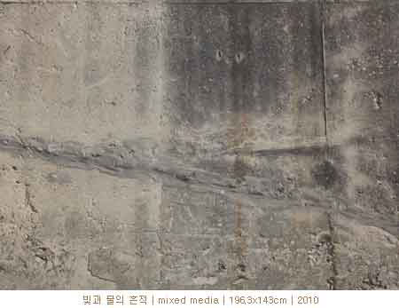 어떤 것은 부분적으로 요철효과를 주어 부조적 으로 만들어 놓고 그 위에 사진을 프린트 한 것도 있다. 미리 사진 촬영해서 선택한 벽 이미지의 표면에 맞게 바탕 면(화면)을 조각적으로 연출하고 그 위에 사진을 전사해 얹혀놓기에 그 환영감이 더 강도 있게 다가온다. 가는 선들이 지나가고 갈라진 틈들이 보이는 벽 위로는 물이 스며들어 퍼져있다. 작가는 그렇게 연출한 벽 위로 물, 습기를 개입시켰다. 물감으로 섬세하게 그려 넣은 부분이다. 순간 냉랭하고 건조한 시멘트는 눅눅해지면서 물기를 포용하고 있다. 작가는 그렇게 삭막한 불임의 단호한 벽안으로 들어가고 상처(깨지고 갈라진 선)를 봉합하고 있다. 그것은 다분히 치유적인 차원이자 시멘트로 대변되는 자신의 삶의 환경과 주변을 인간적인 정서로 흡입해내려는 모종의 마음을 감지시킨다.